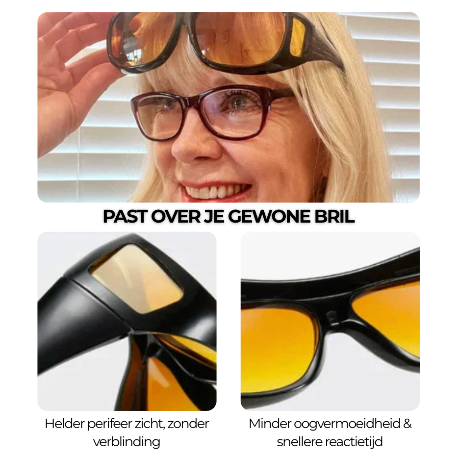 De NightVision Nachtbril vermindert fel wit licht zonder je zicht in het donker te verslechteren, waardoor rijden in de nacht comfortabeler en rustiger aanvoelt.