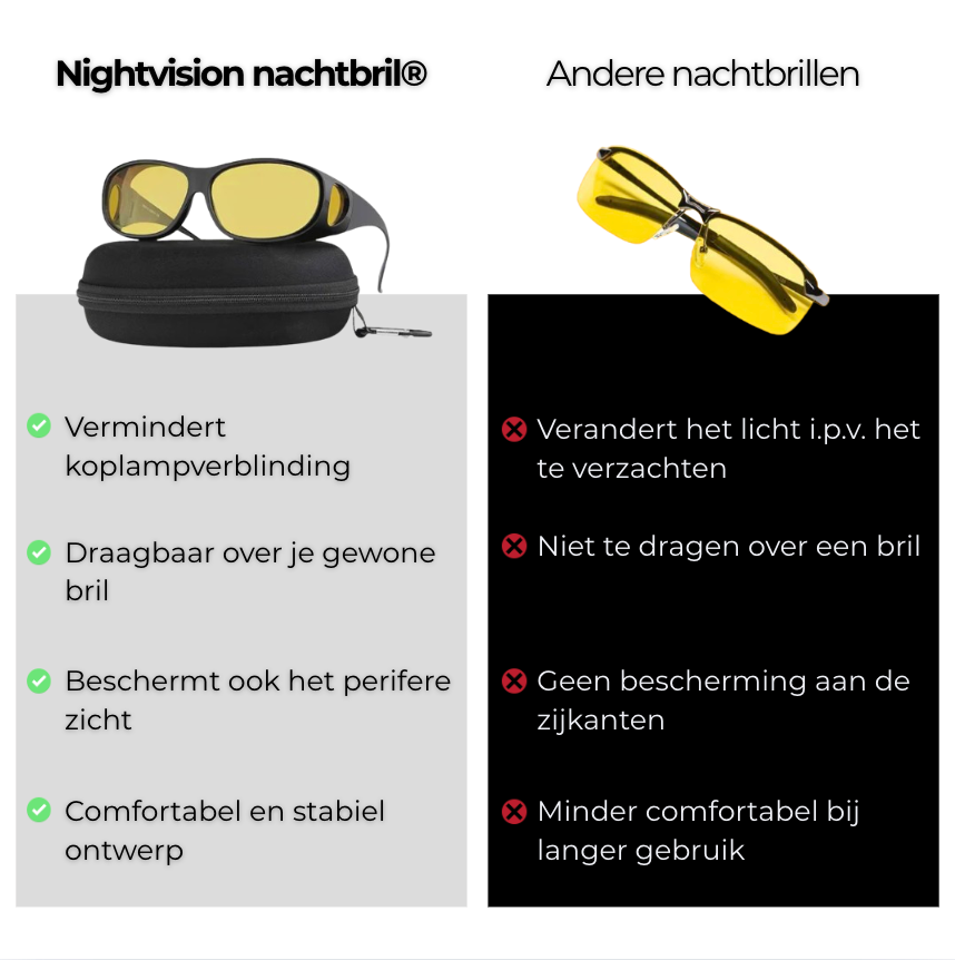 De NightVision Nachtbril kan de ideale oplossing zijn voor rijden in het donker. Duizenden klanten geven aan dat hun zicht en zelfvertrouwen merkbaar zijn verbeterd tijdens het rijden in de avond en nacht.